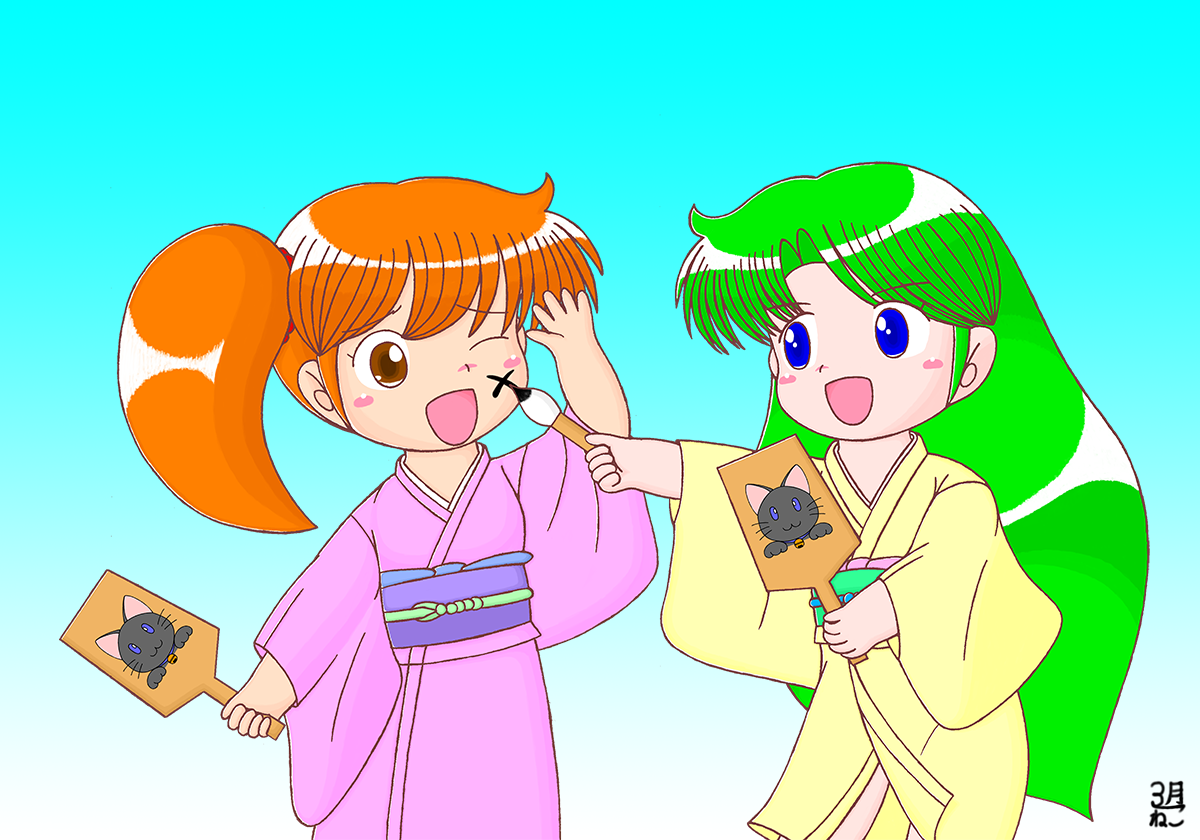 今日はお正月。須美ちゃんとるみる(リュミル)は羽根つきをしてます。おや、須美ちゃん羽根を落としちゃったみたい。るみるに顔に筆でばってんを付けられてしまいました。 このCGは2005年の寒中お見舞いCGとして色んな人に贈ったものの文字なしバージョンです。 当初は年賀CG用として去年の12月から描く作業をしてたんだけど、動きのある着物の絵が上手く描けなかった事、それと色塗りが予想以上にかかってしまった事で完成したのが1月10日、7日正月を過ぎてしまい寒中お見舞いになってしまいました・・・(大汗)。 実を言うと、「チーコと向日葵」以降、キャラの元絵はWeb上で公開している物(72dpi)よりも5倍大きい解像度(360dpi)で描いているのです。以前までは元絵もWeb上で公開している物と同じサイズの72dpiで描いていたのですが、少し本格的に正規CGを描いてみたいと思って「チーコと向日葵」以降360dpiで元絵をスキャンする事にしたのです。 しかし、当然色を塗る面積もでかくなった(5×5=25倍!)訳で陰影付けがとてつもなく大変でした。いつ終わるか分からない状態で地獄見ましたです・・・。 これだけかかるとは本当に予想外だったです。でも、しっかり絵を描きたい気持ちはあるから、季節物描く時は本気で計画立てないといけないなあ・・・。 (2005/1/10UP 1200×840Pixels PhotoshopElements2) |